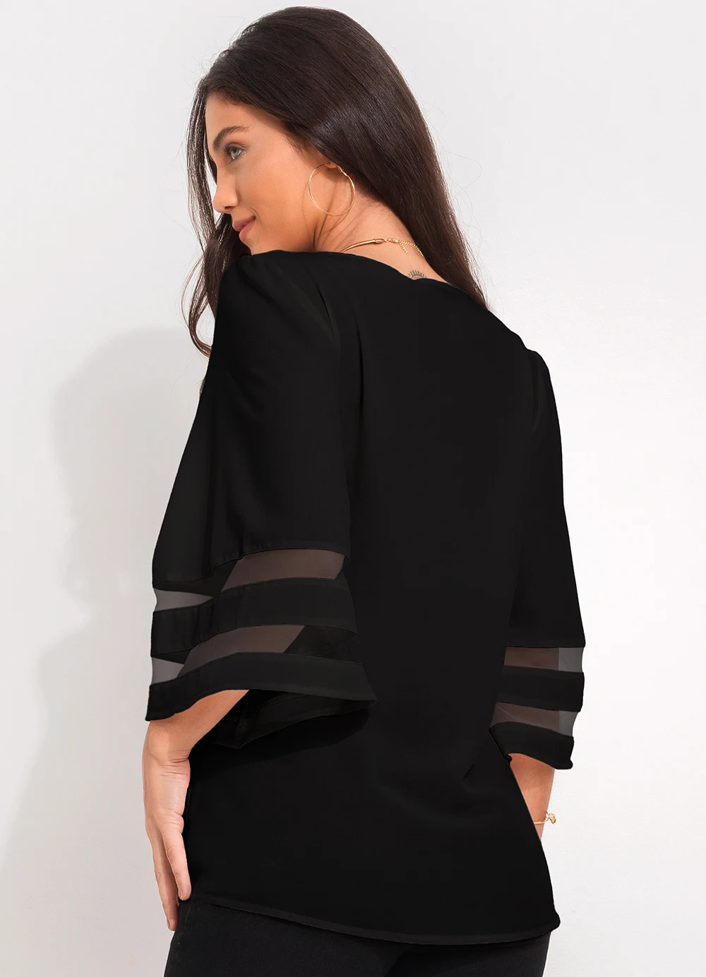 Blusa preta com decote V e mangas 3/4 amplas com detalhe de tiras horizontais vazadas. Modelagem solta e confortável, ideal para looks casuais com um toque elegante.